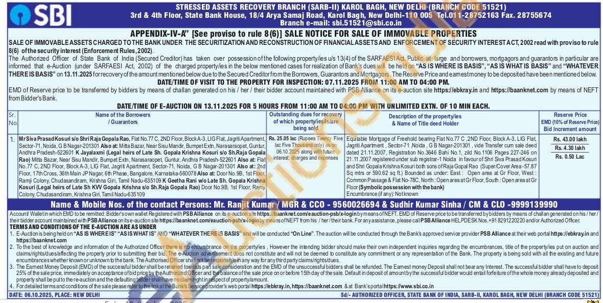 Equitable Mortgage of Freehold bearing Flat No.77 C 2ND Floor, Block A-3. LIG Flat, Jagriti Apartment, Sector-71, Noida GB Nagar-201301, vide Transfer cum sale deed dated 21.11.2007, Registration No. 3646 Bahi No.1, zild No. 1106 Pages 227-246 on 21.11.2007 registered under sub registrar-1 Noida in favour of Shri Siva Prasad Kosuri and Shri Gopala Krishna Kosuri both sons of Raja Gopal Rao (Super Cover Area-57.87 Sq mirs or 590.62 sq ft) Bounded as under. East: Open area at Gr Floor, West Common Passage & Flat No-78C, North: Open area at Gr Floor, South: Open area at Gr Floor (Symbolic possession with the bank)