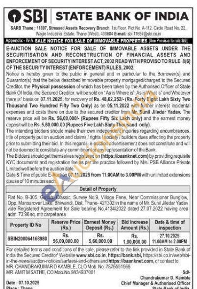 Flat No. B-305, Gayatn Classic, Survey No:9, Village Fene, Near Commissioner Bunglow, Opp. Mansarovar Lake, Bhiwandi, Dist. Thane- 421302 in the name of Mr. Sunil Jiledar Yadav vide Registered Agreement for Sale bearing No.4134/2022 dated 27.07.2022 having area adm. 73.96 sq. mtr carpet area