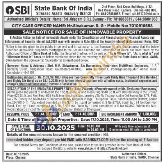 DESCRIPTION OF THE IMMOVABLE PROPERTIES: (Total Property) (Property owned by Mr. Sivakumar Ramasamy) All the piece and parcel of undivided 1587 Sq.ft. share in land measuring 3548 Sq.ft. with RCC building in the Ground Floor 625 Sq.ft. and First Floor 625 Sq.ft. in unfinished stage, bearing Villa No 7 comprised in Old Survey No.87/3, Patta No.775, Survey No.87/3A1A3 of Kanathur Reddy Kuppam Village, Thiruporur Taluk, Kancheepuram District, permit No.024/2010-11. Total extent bounded on the North by: Land comprised in S No 87/2A, South by: 24 feet Common Road, East by Land comprised in S. No 87/3A1A4, West by Land comprised in S No 87/3A2, Within the Sub-Registration District of Thirupporur and Registration District of Chengalpet