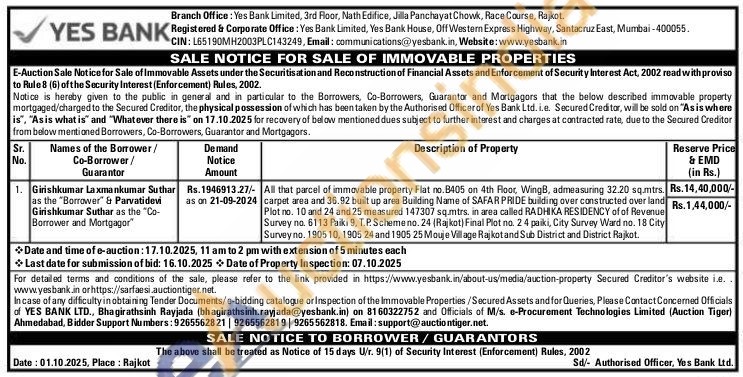All that parcel of immovable property Flat no.8405 on 4th Roor, WingB, admeasuring 32.20 sq.mtrs. carpet area and 36.92 built up area Building Name of SAFAR PRIDE building over constructed over land Plot no. 10 and 24 and 25 measured 147307 sq.mtrs. in area called RADHIKA RESIDENCY of of Revenue Survey no. 6113 Paiki 9, T.P. Scheme no. 24 (Rajkot) Final Plot no. 24 paiki, City Survey Ward no. 18 City Survey no. 1905 10, 1905 24 and 1905 25 Mouje Village Rajkotand Sub District and District Rajkot.