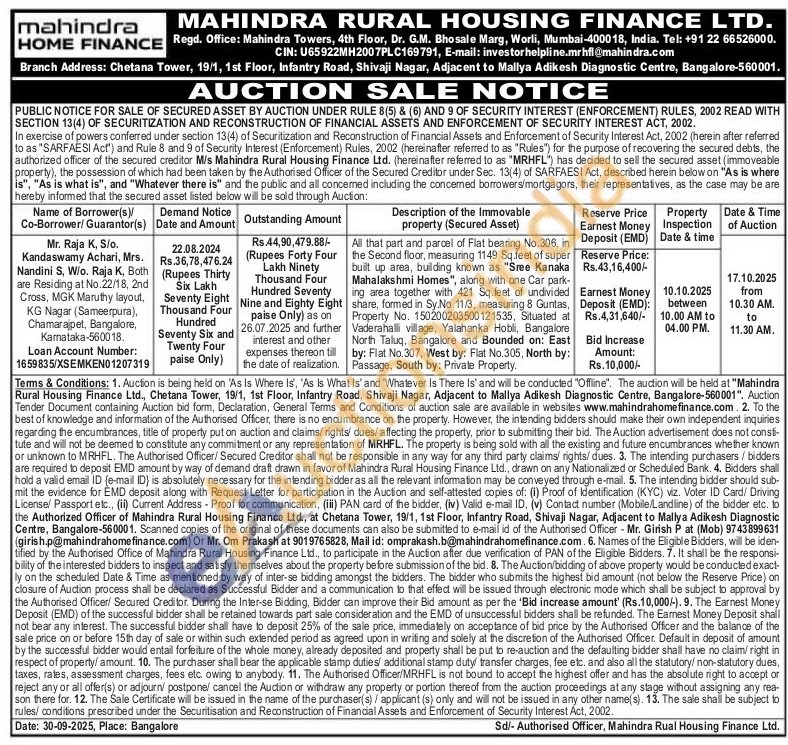 All that part and parcel of Flat bearing No.306, in the Second floor, measuring 1149 Sq.feet of super built up area, building known as "Sree Kanaka Mahalakshmi Homes", along with one Car park-ing area together with 421 Sq.feet of undivided share, formed in Sy.No. 11/3, measuring 8 Guntas, Property No. 150200203500121535, Situated at Vaderahalli village, Yalahanka Hobli, Bangalore North Taluq, Bangalore and Bounded on: East by: Flat No.307, West by: Flat No.305, North by: Passage, South by: Private Property.