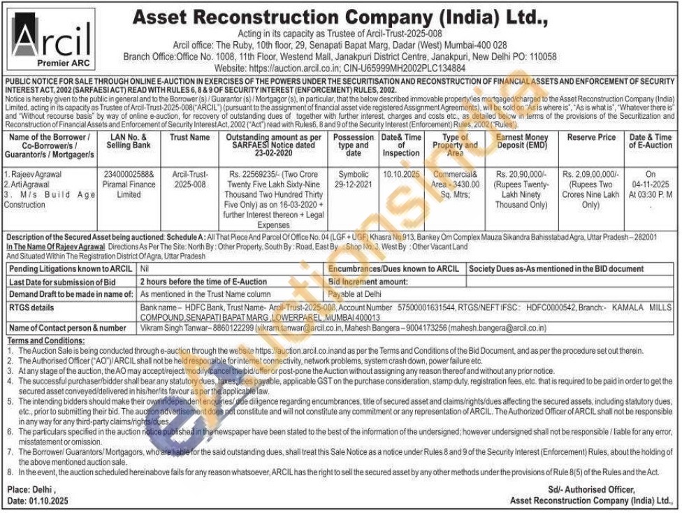 Description of the Secured Asset being auctioned. Schedule A: All That Piece And Parcel Of Office No. 04 (LGF+UGF) Khasra No 913, Bankey Om Complex Mauza Sikandra Bahisstabad Agra, Uttar Pradesh-282001 In The Name Of Rajeev Agrawal Directions As Per The Site: North By: Other Property, South By: Road, East By Shop No. 3, West By: Other Vacant Land And Situated Within The Registration District Of Agra, Uttar Pradesh