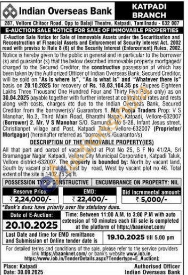 All that part and parcel of vacant land at Plot No 25, S F No 41/2A, Sri Bramanggar Nagar, Katpadi, Vellore City Municipal Corporation, Katpadi Taluk, Vellore district-632007. The property is bounded by: North by vacant land, South by vacant plot no 26, East by road, West by vacant plot no 46. Total extent of the site is 1402.75 Sq ft.
