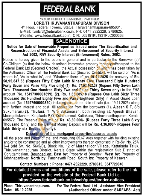 All the piece and parcel of the land measuring 05.67 Ares together with building existing and/or to be constructed and all other improvements thereon comprised in Re-Sy. No. 257/6-4 (old Sy. No. 56/5/B), Block No. 12 of Maranalloor Village, Kattakada Taluk, Thiruvananthapuram District, Kerala State within the registration Sub District of Ooruttambalam. Bounded on: East by: Property of Sreedevi; West by: Property of Krishnapanicker; North by: Panchayath Road; South by: Property of Kesavan.