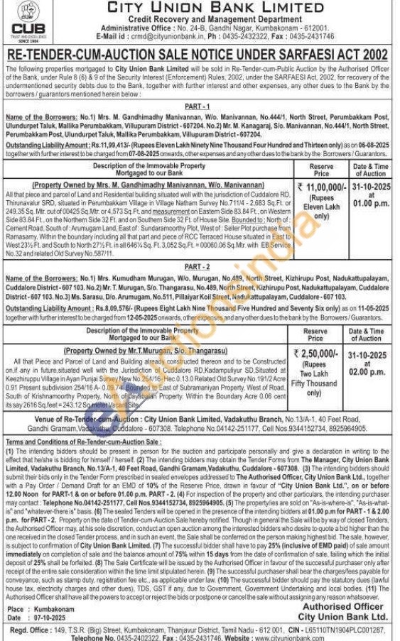 All that piece and parcel of Land and Residential building situated well with the jurisdiction of Cuddalore RD. Thirunavalur SRD, situated in Perumbakkam Village in Vilage Natham Survey No.711/4-2.683 Sq Ft. or 249.35 Sq. Mtr cut of 00425 Sq. Mtr or 4.573 Sq Ft. and measurement on Eastern Side 83.84 Ft, on Western Side 83.84 Ft, on the Northem Side 32 Ft. and on Southem Side 32 FL. of House Site. Bounded to North of Cement Road, South of: Arumugam Land, East of: Sundaramoorthy Plot, West of: Seller Plot purchase from Ramasamy. Within the boundary including all that part and piece of RCC Terraced House situated in East to West 23% Ft. and South to North 27% Ft. in all 646% Sq. Ft. 3,052 Sq. FL-00060.06 Sq Mtr. with EB Service No.32 and related Old Survey No.587/11.