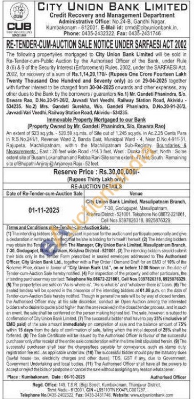 An extent of 623 sq yds-520.50 sq.mts, of Site out of 1.245 sq. yds. in Ac.2.25 Cents Para in R.S No.241/1, Revenue Ward 2, Banda East, Municipal Ward 4, Near D No. 4-911-31, Rajupeta, Machilipatnam, within the Machilipatnam Sub-Registry. Boundaries & Measurements. East: 20 feet wide Road-114.3 feet. West: Donka 112 feet, North Some extent site of Busam Lokanathan and Rebba Rani Site some extent-47 feet, South: Remaining site of Bhupathi Anjiraj @Anjaneya Raju-52 feet
