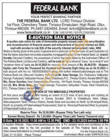 All that plece and parcel of land having an extent of 2.22 Ares of land along with building al improvements thereon situated in Survey Number 190/3 in Chalakkudy West Village, Mukundapuram Taluk, Thrissur District, Kerala State and bounded on North: by Municipal Road, South by property of Pulltanivallappil Kunjuvareed, East: by Municipal Road and West by property of Palamattath Kuttiyil Jose