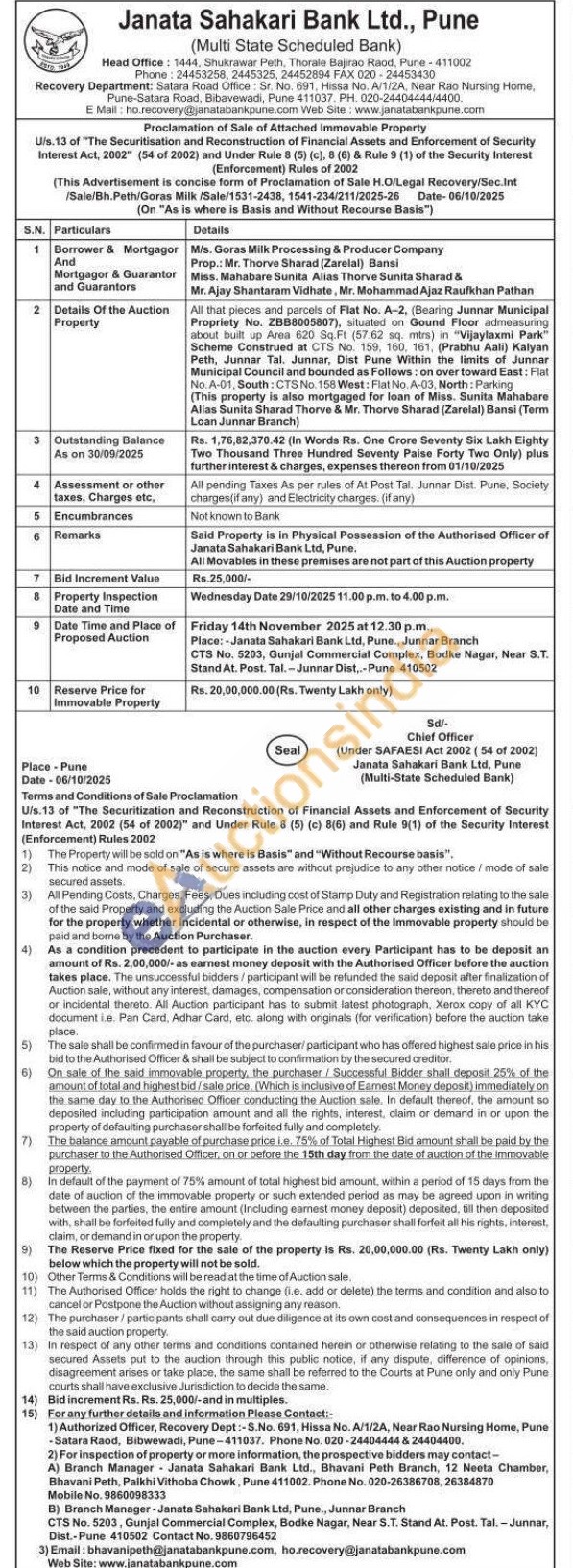 All that pieces and parcels of Flat No. A-2, (Bearing Junnar Municipal Propriety No. ZBB8005807), situated on Gound Floor admeasuring about built up Area 620 Sq.Ft (57.62 sq. mtrs) in "Vijaylaxmi Park" Scheme Construed at CTS No. 159, 160, 161, (Prabhu Aali) Kalyan Peth, Junnar Tal. Junnar, Dist Pune Within the limits of Junnar Municipal Council and bounded as Follows: on over toward East: Flat No.A-01, South: CTS No. 158 West: Flat No. A-03, North: Parking (This property is also mortgaged for loan of Miss. Sunita Mahabare Alias Sunita Sharad Thorve & Mr. Thorve Sharad (Zarelal) Bansi (Term Loan Junnar Branch)