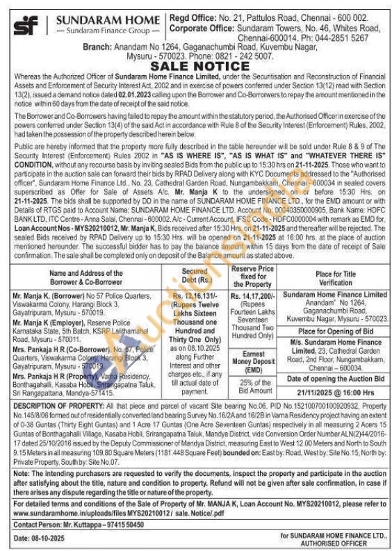 DESCRIPTION OF PROPERTY: All that piece and parcel of vacant Site bearing No.06, PID No.152100700100920932, Property No. 145/8/06 formed out of residentially converted land bearing Survey No. 16/2A and 16/28 in Varna Residency project having an extent of 0-38 Guntas (Thirty Eight Guntas) and 1 Acre 17 Guntas (One Acre Seventeen Guntas) respectively in all measuring 2 Acers 15 Guntas of Bonthagahalli Village, Kasaba Hobili, Srirangapatna Taluk, Mandya District, vide Conversion Order Number ALN(2)44/2016-17 dated 25/10/2016 issued by the Deputy Commissioner of Mandya District, measuring East to West 12.00 Meters and North to South 9.15 Meters in all measuring 109.80 Square Meters (1181.448 Square Feel) bounded on: East by: Road, West by: Site No. 15, North by: Private Property, Southby: Site No.07.