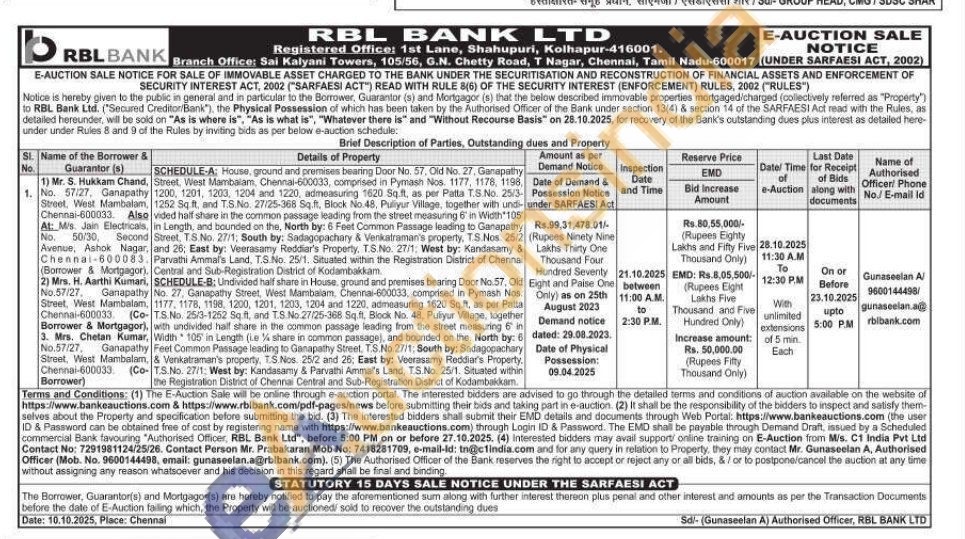 SCHEDULE-A: House, ground and premises bearing Door No. 57, Old No. 27, Ganapathy 1) Mr. S. Hukkam Chand, Street, West Mambalam, Chennai-600033, comprised in Pymash Nos. 1177, 1178, 1198, 1200, 1201, 1203, 1204 and 1220, admeasuring 1620 Sq.ft, as per Patta T.S.No. 25/3-1252 Sq ft, and T.S.No. 27/25-368 Sq.ft, Block No.48, Puliyur Village, together with vided hail share in the common passage leading from the street measuring 6" in Width 105" in Length, and bounded on the, North by: 6 Feet Common Passage leading to Ganapathy Street, T.S.No. 27/1; South by: Sadagopachary & Venkatraman's property, T.S.Nos. 25/2) , and 26; East by: Veerasamy Reddiar's Property, T.S.No. 27/1: West by: Kandasamy & Parvathi Ammal's Land, T.S.No. 25/1. Situated within the Registration District of Chennai , Central and Sub-Registration District of Kodambakkam.