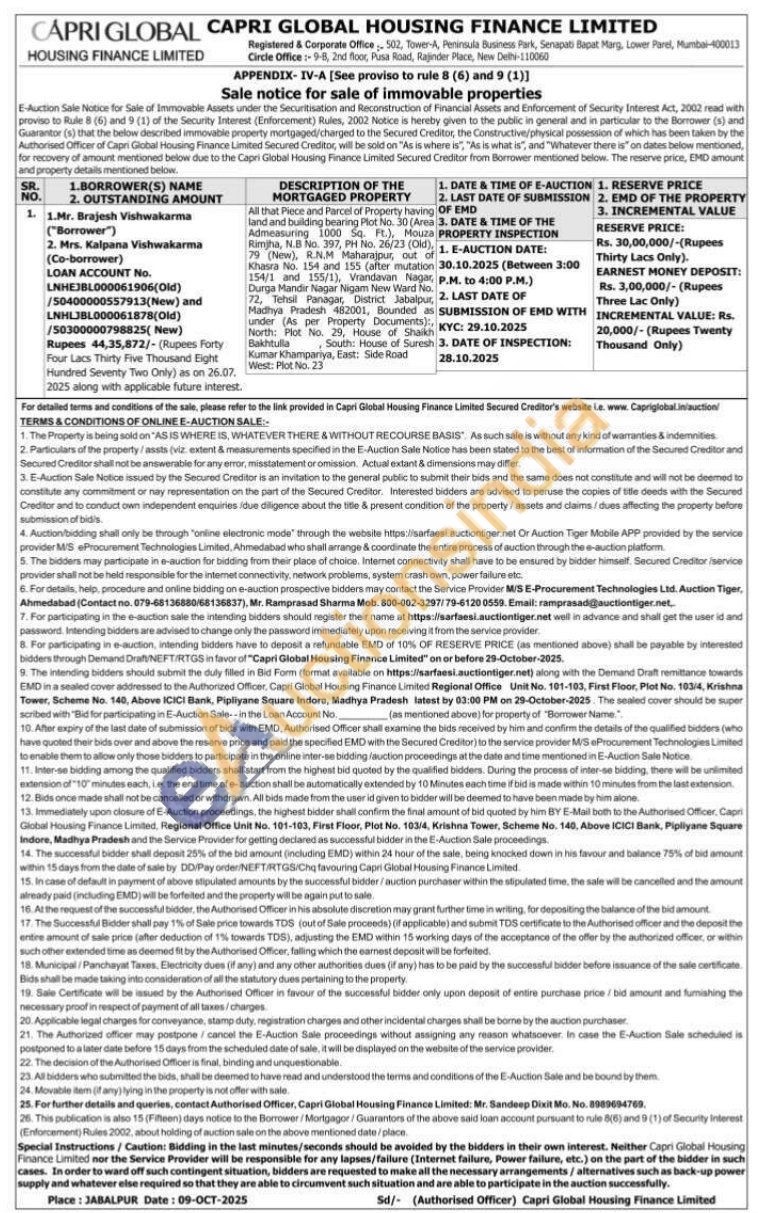All that Piece and Parcel of Property having land and building bearing Plot No. 30 (Area) Admeasuring 1000 Sq. Ft.), Mouza Rimjha, N.B No. 397, PH No. 26/23 (Old), 79 (New), R.N.M Maharajpur, out of Khasra No. 154 and 155 (after mutation 154/1 and 155/1), Vrandavan Nagar, Durga Mandir Nagar Nigam New Ward No. 72, Tehsil Panagar, District Jabalpur, Madhya Pradesh 482001, Bounded as under (As per Property Documents):, North: Plot No. 29, House of Shaikh Bakhtulla South: House of Suresh Kumar Khampariya, East: Side Road West: Plot No. 23