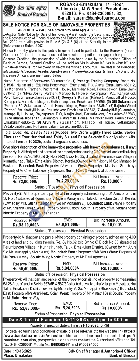 Property-3: All that part and parcel of the property consisting of property admeasuring 4.09 Ares of land and building therein, Re. Sy No.32 (old Sy No 8) Block No 85 situated at Perumbavoor Village in Kunnathunadu Taluk, Ernakulam District. (Owned by Mr. Arun S/o Mr. Manappilly Sivankutty). Bounded: East: Property of Mr. Vasu; West: Property of Ms.Pankajakshy; South: Way; North: Property of Mr.Paul Agencies.