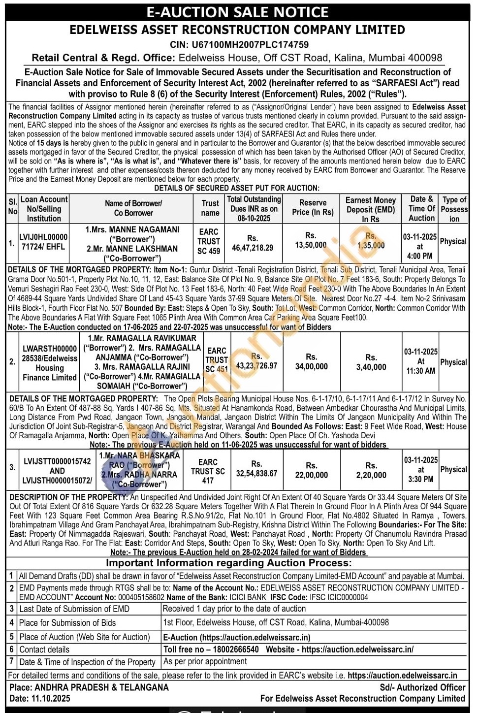 DESCRIPTION OF THE PROPERTY: An Unspecified And Undivided Joint Right Of An Extent Of 40 Square Yards Or 33.44 Square Meters Of Site Out Of Total Extent Of 816 Square Yards Or 632.28 Square Meters Together With A Flat Therein In Ground Floor In A Plinth Area Of 944 Square Feet With 123 Square Feet Common Area Bearing R.S.No.91/2c, Flat No.101 In Ground Floor, Flat No.4802 Situated In Ramya Towers, Ibrahimpatnam Village And Gram Panchayat Area, Ibrahimpatnam Sub-Registry, Krishna District Within The Following Boundaries:- For The Site: East: Property Of Nimmagadda Rajeswari, South: Panchayat Road, West: Panchayat Road, North: Property Of Chanumolu Ravindra Prasad And Atluri Ranga Rao. For The Flat: East: Corridor And Steps, South: Open To Sky, West: Open To Sky, North: Open To Sky And Lift.