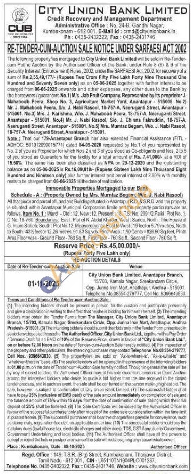 Immovable Properties Mortgaged to our Bank : Schedule-A: (Property Owned by Mrs. Mumtaz Begam, W/o. J. Nabi Rasool): All that piece and parcel of Land and Building situated in Anantapur R.D. & S.R.D. and the property is situated within Anantapur Municipal Corporation limits and the property particulars are as follows. Item No. 1: Ward-Old: 12. New: 12. Present: 18. T.S. No. 2091/2 Paiki, Plot No. 1. D.No. 18-760, Boundaries: East: Plot of N. Abdul Khader, West: Sandu, North: The House of G. Imam Saheb, South: Plot No 12. Measurements: East to West: 19 feet or 5.79 metres, North to South: 43% feet or 12.26 metres. 91.83 Sq yds. Plinth Area: 1.90 Cents=826.50 Sq. feet, Plinth Area Floor wise-Ground Floor-760 Sq.ft. First Floor-760 Sq. ft., Second Floor-760 Sq.ft