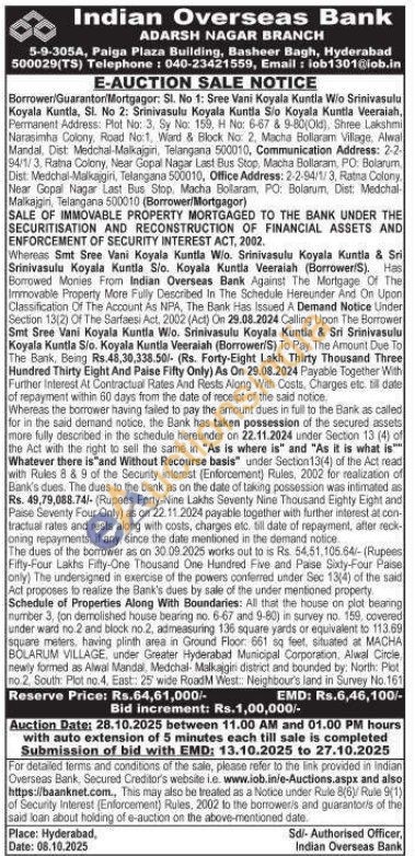 Schedule of Properties Along With Boundaries: All that the house on plot bearing number 3, (on demolished house bearing no. 6-67 and 9-80) in survey no. 159, covered under ward no.2 and block no.2, admeasuring 136 square yards or equivalent to 113.69 square meters, having plinth area in Ground Floor: 661 sq feet, situated at MACHA BOLARUM VILLAGE, under Greater Hyderabad Municipal Corporation, Alwal Circle, newly formed as Alwal Mandal, Medchal-Malkajgin district and bounded by: North: Plot no.2, South: Plot no.4, East: 25 wide RoadM West:: Neighbour's land in Survey No.161