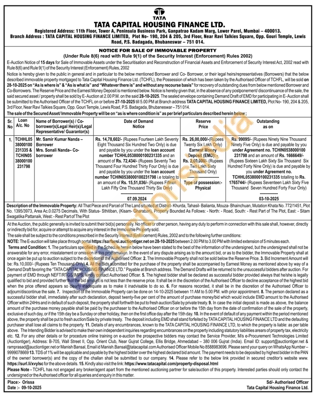 All That Piece and Parcel of The Land situated at District-Khurda, Tahasil-Balianta, Mouza-Bhainchuan, Mutation Khata No. 772/1451, Plat No. 1395/3973, Area Ac 0.0275 Decimals, With Status- Sthitiban, (Kisam- Gharabari), Property Bounded As Follows:- North: -Road, South-Rest Part of The Plot, East - Sitam Swagatika Pattanaik, West:-Rest Part of The Plot