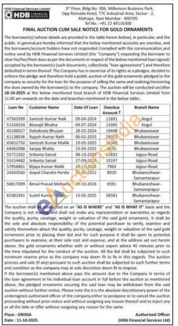 HDB Financial Services Limited Gold Auctions Auction in Angul