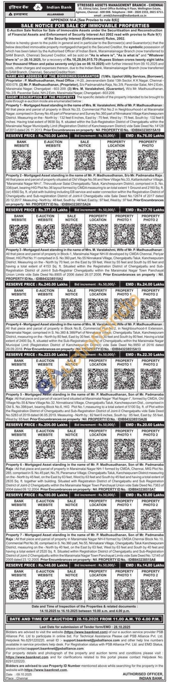 Property 1-Mortgaged Asset standing in the name of Mrs. M. Varalakshmi, Wife of Mr. P. Madhusudhanan: All that piece and parcel of property in Block No.33, Commercial Plot No.2 in Neighbourhood-I at Maraimalai Nagar, comprised in Survey No.45 part of Peramanur and Survey No.360 part of Ninnakarai Village Kancheepuram District. Measuring on the-North by: 132 feet 6 inches, East by: 75 feet, West by: 75 feet, South by: 132 feet 6 inches. Having total extent of 9938 Sq. ft. situated within the Sub-Registration District of Chengalpattu within the Maraimalai Nagar Municipality Limit (Registration District of Kancheepuram District) vide Sale Deed No.14128 of 2013 dated 26.11.2013. Prior Encumbrances on property: Nil. PROPERTY ID No.: IDIB843238515A10