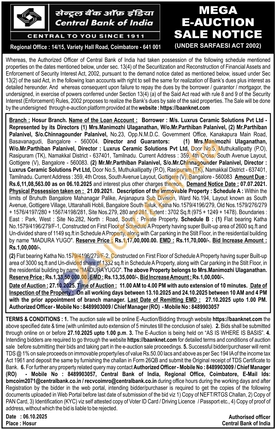 Authorized Officer - Mobile No: 8489903009 / Chief Manager (RO) - Mobile No: 8489903057