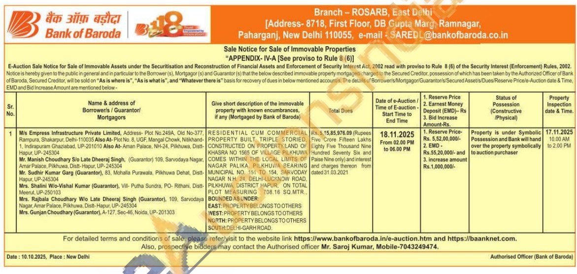 RESIDENTIAL CUM COMMERCIAL PROPERTY BUILT. TRIPLE STORIED, CONSTRUCTED ON PROPERTY LAND OF KHASRA NO 1565 OF VILLAGE PILKHUWA COMES WITHIN THE LOCAL LIMITS OF NAGAR PALIKA PILKHUWA BEARING MUNICIPAL NO. 151 TO 154, SARVODAY NAGAR N.H. 24. DELHI-LUCKNOW ROAD, PILKHUWA, DISTRICT HAPUR, ON TOTAL PLOT MEASURING 708.16 SQ.MTR BOUNDED AS UNDER: