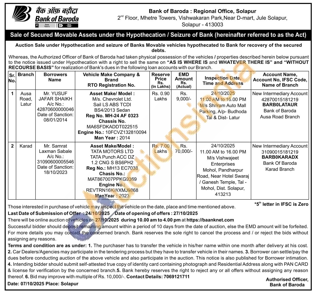 Asset Make/Model: M/s. Chevrolet Ltd. Sail LS ABS TCDI BS4/2013 Sedan Reg No. MH-24 AF 0323 Chassis No. MA6SFDKADDT022515 Engine No.: 10FCVZ132810094 Man Year: 2014