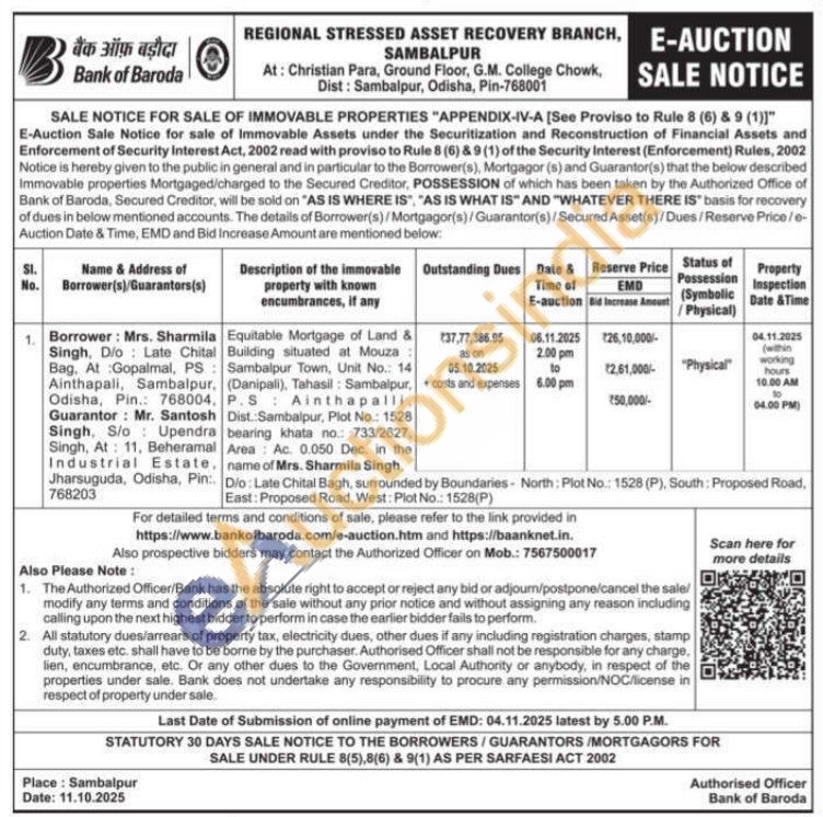 Equitable Mortgage of Land & Building situated at Mouza: Sambalpur Town, Unit No.: 14 (Danipali), Tahasil: Sambalpur P.S: Ainthapalli, Dist: Sambalpur, Plot No.: 1528 bearing khata no.: 733/2627, Area: Ac. 0.050 Dec, in the name of Mrs. Sharmila Singh, Dio: Late Chital Bagh, surrounded by Boundaries - North: Plot No.: 1528 (P), South: Proposed Road, East: Proposed Road, West: Plot No.: 1528(P)