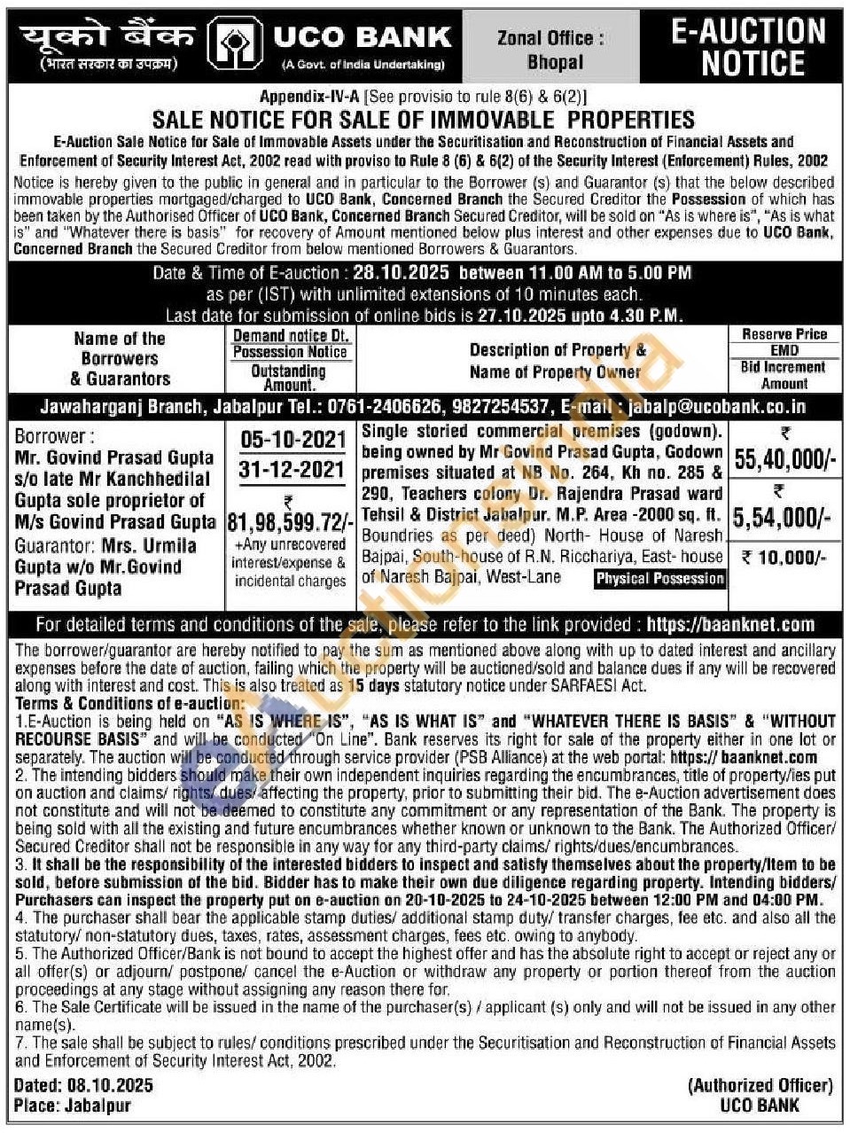 Single storied commercial premises (godown). being owned by Mr Govind Prasad Gupta, Godown premises situated at NB No. 264, Kh no. 285 & 290, Teachers colony Dr. Rajendra Prasad ward Tehsil & District Jabalpur. M.P. Area-2000 sq. ft. Boundries as per deed) North- House of Naresh Bajpai, South-house of R.N. Ricchariya, East-house of Naresh Bajpai, West-Lane