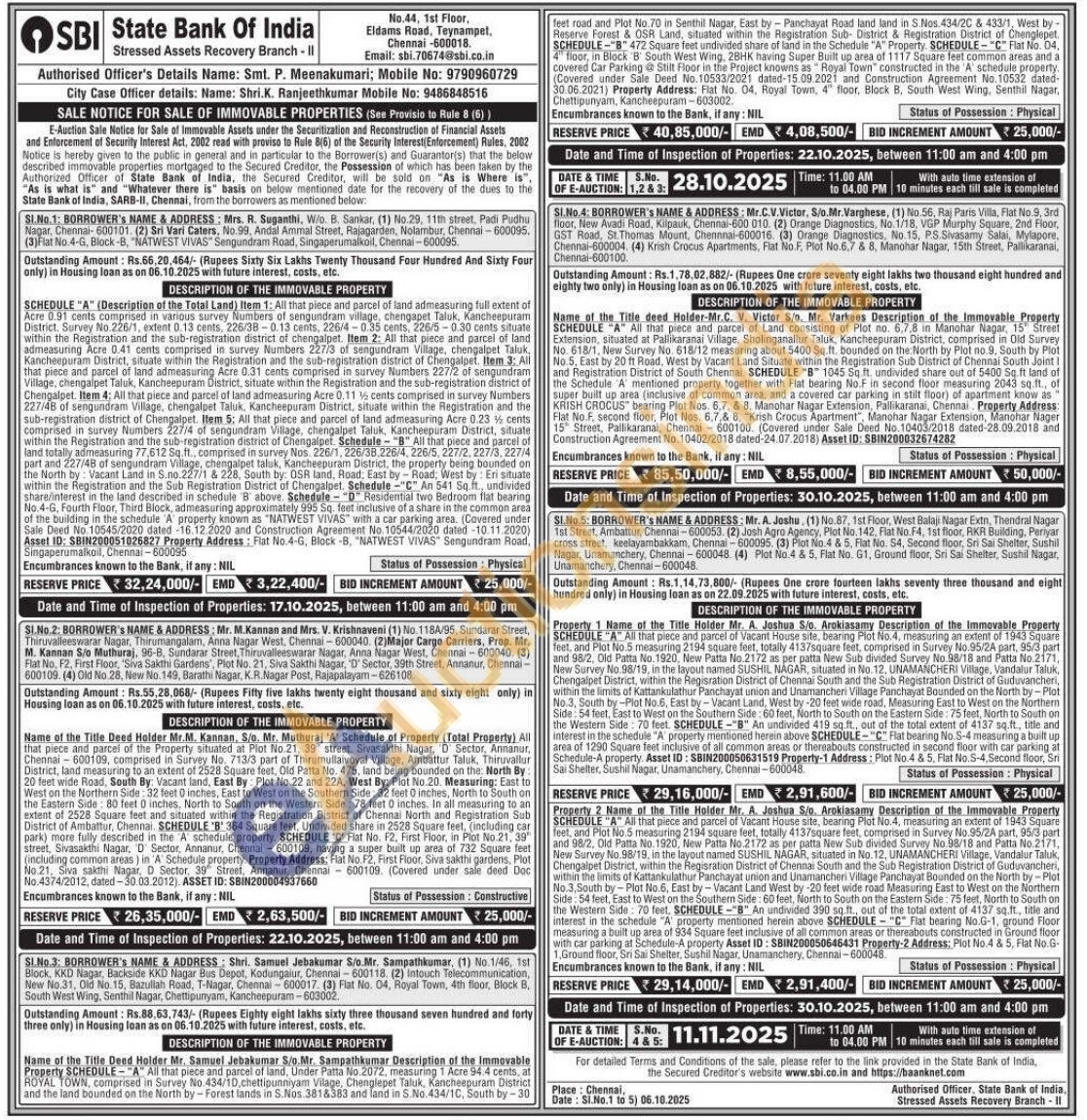 5) Property 2 Name of the Title Holder Mr. A. Joshua S/o. Arokiasamy Description of the Immovable Property SCHEDULE "A" All that piece and parcel of Vacant House site, bearing Plot No.4, measuring an extent of 1943 Square feet, and Plot No.5 measuring 2194 square feet, totally 4137square feet, comprised in Survey No.95/2A part, 95/3 part and 98/2, Old Patta No. 1920, New Patta No.2172 as per patta New Sub divided Survey No.98/18 and Patta No.2171, New Survey No.98/19, in the layout named SUSHIL NAGAR, situated in No. 12, UNAMANCHERI Village, Vandalur Taluk, Chengalpet District, within the Regisration District of Chennai South and the Sub Registration District of Guduvancheri, within the limits of Kattankulathur Panchayat union and Unamancheri Village Panchayat Bounded on the North by-Plot No.3, South by-Plot No.6, East by-Vacant Land West by -20 feet wide road Measuring East to West on the Northern Side: 54 feet, East to West on the Southern Side: 60 feet, North to South on the Eastern Side: 75 feet, North to South on the Western Side: 70 feet, SCHEDULE-"B" An undivided 390 sq.ft., out of the total extent of 4137 sq.ft., title and interest in the schedule "A' property mentioned herein above SCHEDULE "C" Flat bearing No.G-1, ground Floor measuring a built up area of 934 Square feet inclusive of all common areas or thereabouts constructed in Ground floor with car parking at Schedule-A property Asset ID: SBIN200050646431 Property-2 Address: Plot No.4 & 5, Flat No.G-1,Ground floor, Sri Sai Shelter, Sushil Nagar, Unamanchery, Chennai-600048. Encumbrances known to the Bank, if any: NIL