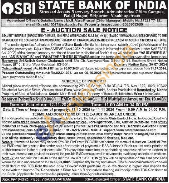 SCHEDULE OF PROPERTY : All that piece and parcel of house site admeasuring 250.2/9 Sq.yds. D.No.3D-9-4, T.S. Nos. 1022, 1023, 1024/2 Situated at Mavuduri Street, Western street, Eluru, West Godavari District, Andhra Pradesh and Bounded by: North: Property of Battula Balakrishna, South: Main Road, East: Property of Battula Balakristina, West: Joint Gate