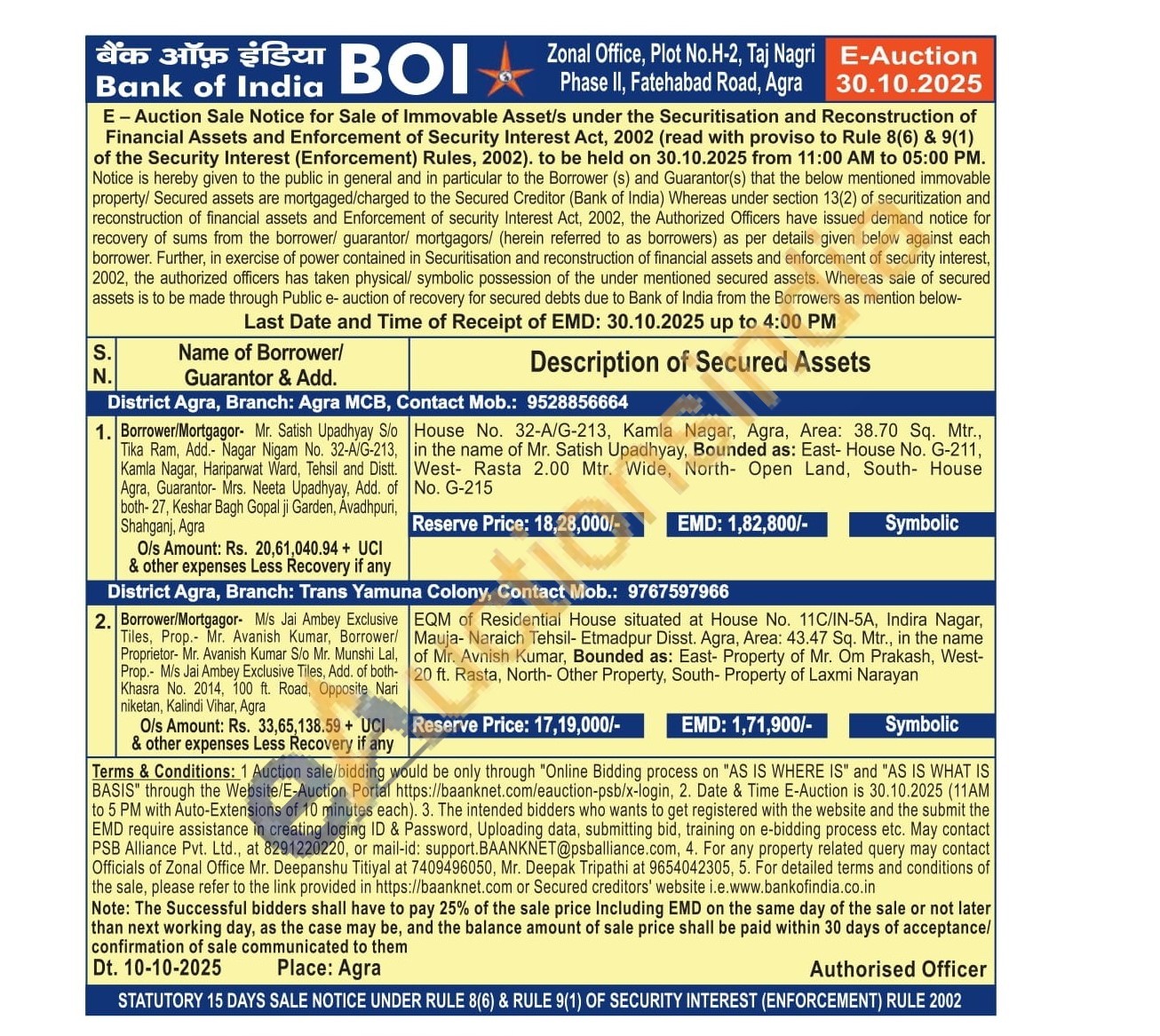 EQM of Residential House situated at House No. 11C/IN-5A, Indira Nagar, Mauja- Naraich Tehsil- Etmadpur Disst. Agra, Area: 43.47 Sq. Mtr., in the name of Mr. Avnish Kumar, Bounded as: East- Property of Mr. Om Prakash, West-20 ft. Rasta, North- Other Property, South- Property of Laxmi Narayan