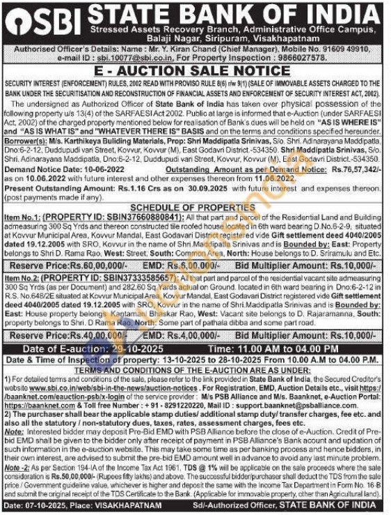 Authorised Officer's Details: Name: Mr. Y. Kiran Chand (Chief Manager). Mobile No : 9160949910