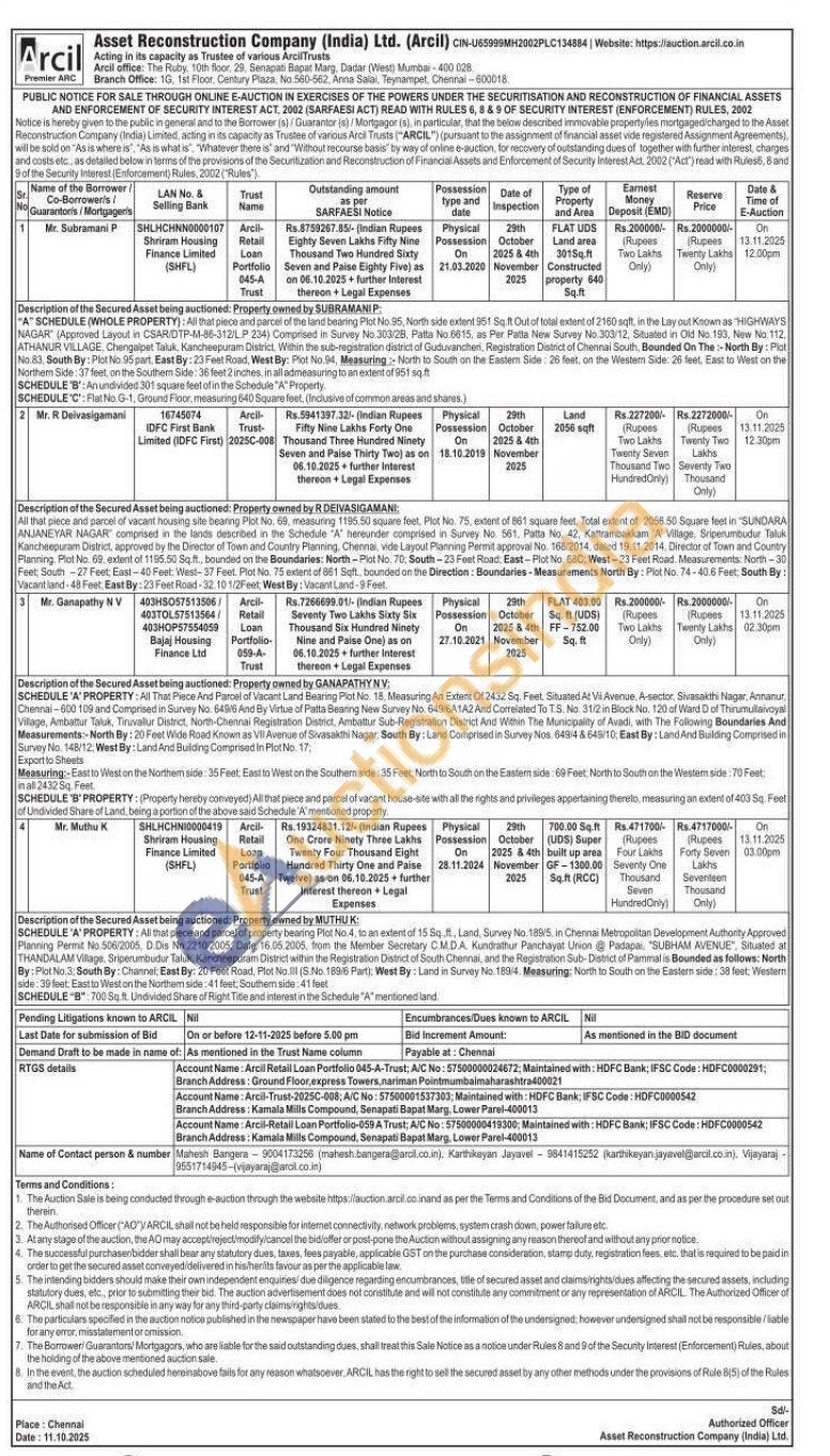 4) All that piece and parcel of property bearing Plot No.4, to an extent of 15 Sq.,ft., Land, Survey No. 189/5, in Chennai Metropolitan Development Authonity Approved Planning Permit No.506/2005, D.Dis No. 2210/2005, Date 16.05.2005, from the Member Secretary CMDA. Kundrathur Panchayat Union Padapai, "SUBHAM AVENUE", Situated at THANDALAM Village, Sriperumbudur Taluk, Kancheepuram District within the Registration District of South Chennai, and the Registration Sub-District of Pammal is Bounded as follows: North By: Plot No. 3: South By: Channel, East By: 20 Feet Road, Plot No.Ill (S.No. 189/6 Part): West By: Land in Survey No. 189/4. Measuring: North to South on the Eastern side: 38 feet. Western side: 39 feet: East to West on the Northem side: 41 feet, Southem side: 41 feet SCHEDULE "B" 700 Sq. ft. Undivided Share of Right Title and interest in the Schedule "A" mentioned land,