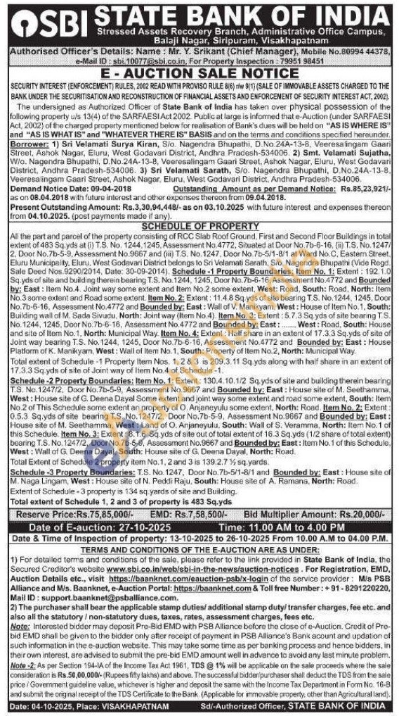 All the part and parcel of the property consisting of RCC Slab Roof Ground, First and Second Floor Buildings in total extent of 483 Sq.yds at (i) T.S. No. 1244, 1245, Assessment No. 4772, Situated at Door No. 7b-6-16. (T.S, No. 1247/2. Door No.7b-5-9, Assessment No.9667 and (iii) T.S. No. 1247, Door No.7b-5/1-8/1 at Ward No.C. Eastem Street. Eluri Municipality, Eluru, West Godavari District belongs to Sri Velamati Sarath, Slo. Nagendra Bhupathi (Vide Regd. Sale Deed Nos.9290/2014, Date: 30-09-2014) Schedule -1 Property Boundaries: Item No. 1: Extent: 192.1.0 Sq.yds of site and building therein bearing T.S. No. 1244, 12:45, Door No.7b-6-16, Assessment No.4772 and Bounded by: East: Item No.4. Joint way some extent and Item No.2 some extent, West: Road, South: Road, North: Item No.3 some extent and Road some extent. Item No. 2: Extent: 11.4.8 Sq.yds of site bearing T.S. No. 1244, 1245, Door No.7b-6-16, Assessment No.4772 and Bounded by: East: Wall of V. Manikyam, West: House of Item No. 1, South: Building wall of M. Sada Sivudu, North: Joint way (Bem No. 4) Item No. 3: Extent: 5.7.3 Sq yds of site bearing TS. No. 1244, 1245, Door No.7b-6-16, Assessment No.4772 and Bounded by: East: West: Road, South: House and site of Item No. 1, North: Municipal Way. Item No. 4: Extent: Half share in an extent of 17.3.3 Sq.yds of site of Joint way bearing T.S. No. 1244, 1245, Door No.7b-6-16, Assessment No.4772 and Bounded by: East: House Platform of K. Manikyan, West: Wall of Item No. 1, South: Property of Item No.2, North: Municipal Way