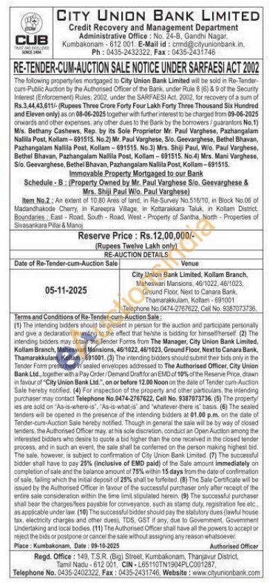 Schedule B: (Property Owned by Mr. Paul Varghese Sio, Geevarghese & Mrs. Shiji Paul W/o. Paul Varghese) Item No.2: An extent of 10.80 Ares of land, in Re-Survey No.516/10, in Block No.06 of Madandhakode Cherry, in Kareepra Village, in Kottarakkara Taluk, in Kollam District Boundaries East Road, South Road, West Property of Santha, North Properties of Sivasarikara Pila & Manoj