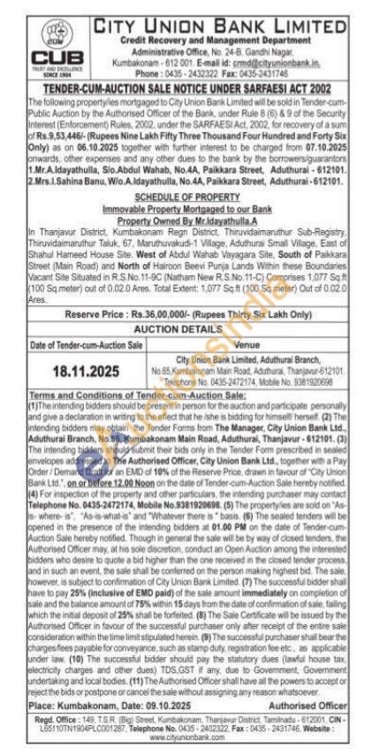 In Thanjavur District, Kumbakonam Regn District, Thiruvidaimaruthur Sub-Registry. Thiruvidaimaruthur Taluk, 67, Maruthuvakudi-1 Village, Aduthurai Small Village. East of Shahul Hameed House Site. West of Abdul Wahab Vayagara Site, South of Pakkara Street (Main Road) and North of Hairoon Beevi Purija Lands Within these Boundaries Vacant Site Situated in R.S.No. 11-9C (Natham New R.S.No.11-C) Comprises 1,077 Sq ft (100 Sq.meter) out of 0.020 Ares. Total Extent: 1,077 Sq.ft (100 Sq meter) Out of 0:02.0 Ares