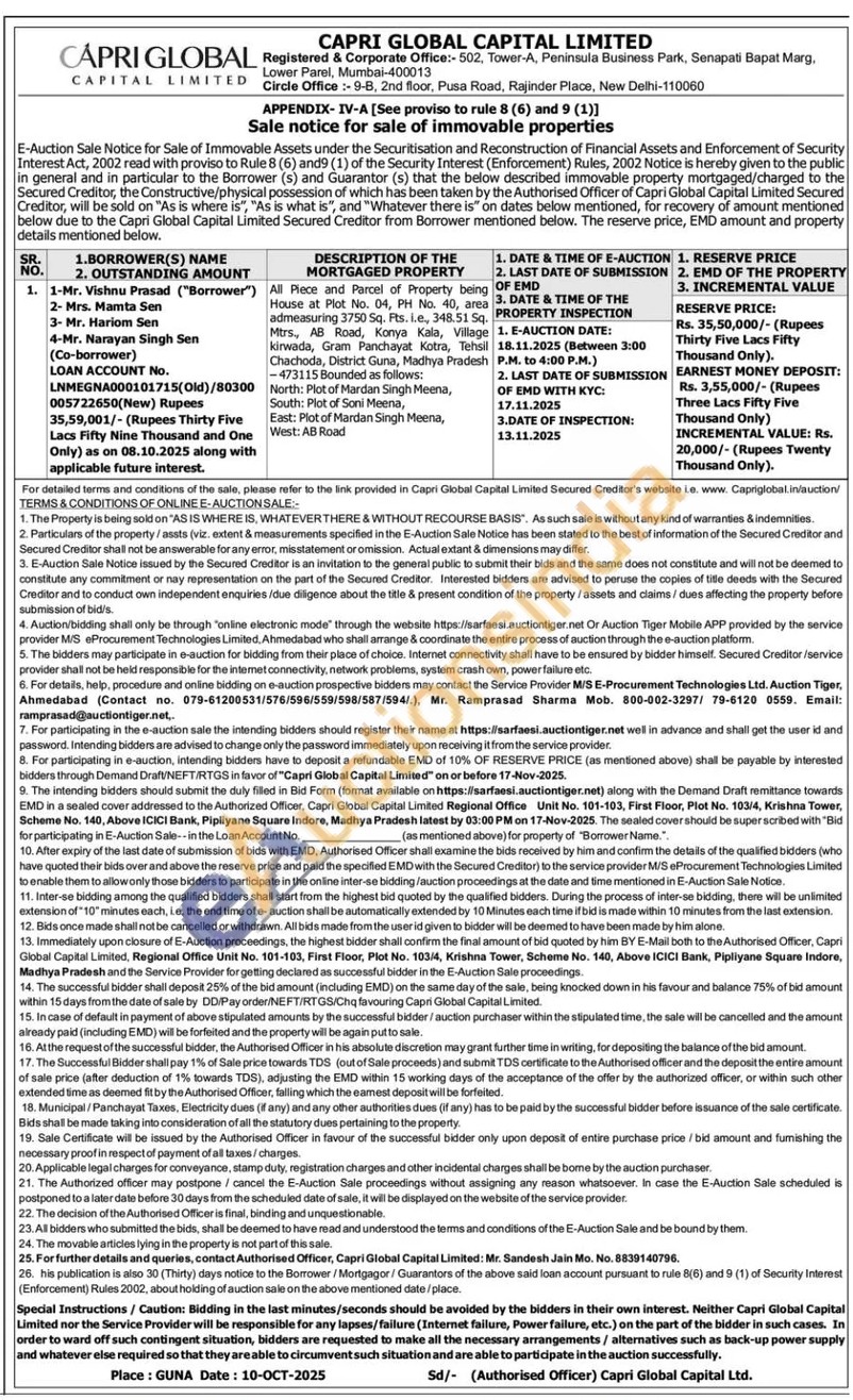 All Piece and Parcel of Property being House at Plot No. 04, PH No. 40, area admeasuring 3750 Sq. Pts. i.e, 348.51 Sq. Mtrs, AB Road, Konya Kala, Village kirwada, Gram Panchayat Kotra, Tehsil Chachoda, District Guna, Madhya Pradesh -473115 Bounded as follows: North: Plot of Mardan Singh Meena,