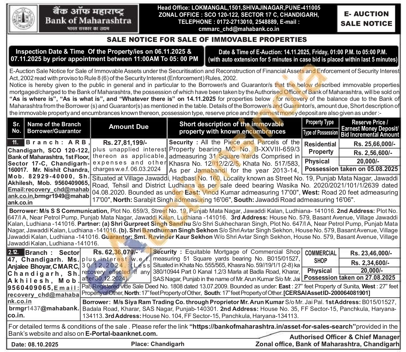 Security: All the Piece and Parcels of the Property bearing MC No. B-XXVIII-659/3 admeasuring 31 Square Yards Comprised in Khasra No. 12//12/2/2/5, Khata No. 517/583 As per Jamabandi for the year 2013-14 Situated at Village Jawaddi, Hadbast No. 160, Locality known as Street No. 19, Punjab Mata Nagar, Jawaddi Road, Tehsil and District Ludhiana as per sale deed bearing Wasika No. 2020/2021/101/1/2639 dated 04.08.2020. Bounded as under: East: Vinod Kumar admeasuring 17'00", West: Road 20 feet admeasuring 17'00", North: Sarabjit Singh admeasuring 16'06", South: Jawaddi Road admeasuring 16'06".