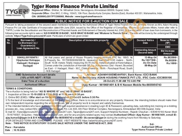 All that peace and parcel of House Property bearing Honnatti VPC No. 169/3, its E-Property No. 15170050300020061 1700503000200616, measuring East-West 4.95 meters, North-South 10.06 meters Totally measuring 49.79 chores meters situated at Keremallapur, Comes under the Jurisdiction of Honnatti GP, Tq-Ranebennur, Dist-Haveri, Bounded as East - V Hadagali, West-M.C. Chikkannanavar, North Panchayat Road, South - M.B.Hadagali