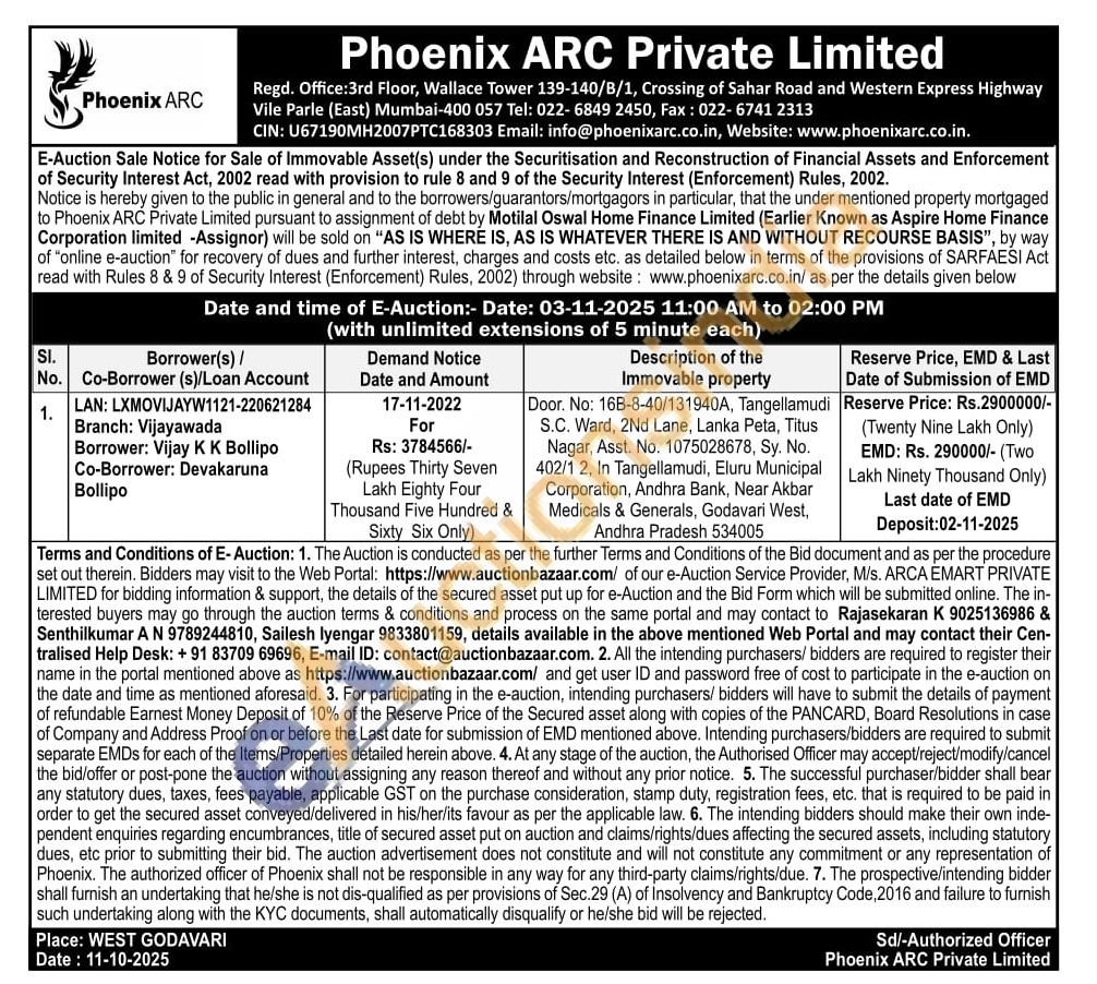 Door. No: 16B-8-40/131940A, Tangellamudi S.C. Ward, 2Nd Lane, Lanka Peta, Titus Nagar, Asst. No. 1075028678, Sy. No. 402/1 2, In Tangellamudi, Eluru Municipal Corporation, Andhra Bank, Near Akbar Medicals & Generals, Godavari West, Andhra Pradesh 534005