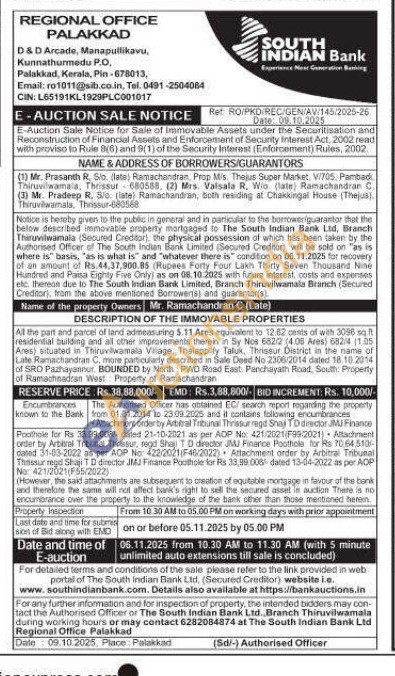 All the part and parcel of land admeasuring 5.11 Ares equivalent to 12.62 cents of with 3096 sq ft residential building and all other improvements therein in Sy Nos 682/2 (4.00 Ares) 682/14 11:05 Ares situated in Thiruvilwarnala Village. Thalappilly Taluk, Thrissur District in the name of Late Ramachandran C. more particularly described in Sale Deed No 2306/2014 dated 18. 18.10.2014 10.2 of SRO Pazhayannur BOUNDED by North: PAD North: PWD Road East. Panchayath Road, South Property of Ramachnadran West Property of Ramachandran