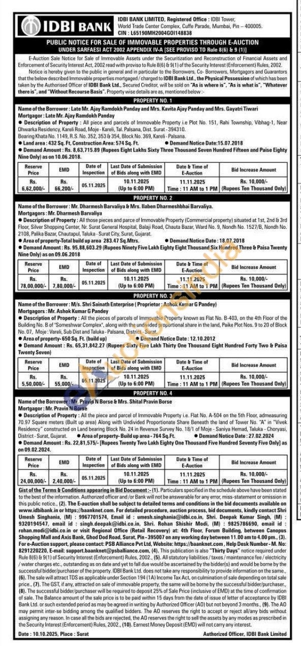 Description of Property: All those pieces and parce of Immovable Property (Commercial property) situated at 1st, 2nd & 3rd Floor, Silver Shopping Center, Nr. Surat General Hospital, Balaji Road, Chauta Bazar, Ward No. 9, Nondh No. 1527/B, Nondh No. 2108, Palika Bazar, Chautapul, Taluka Surat City, Surat, Gujarat.