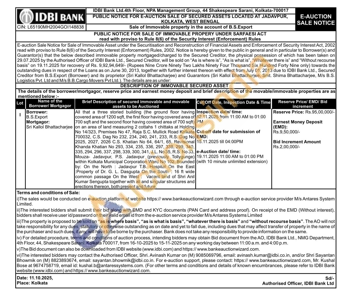 Authorised Officer, Shri. Avinash Kumar on (M) 9085069796,Shri Sayantan Bhowmik on (M) 8823893674