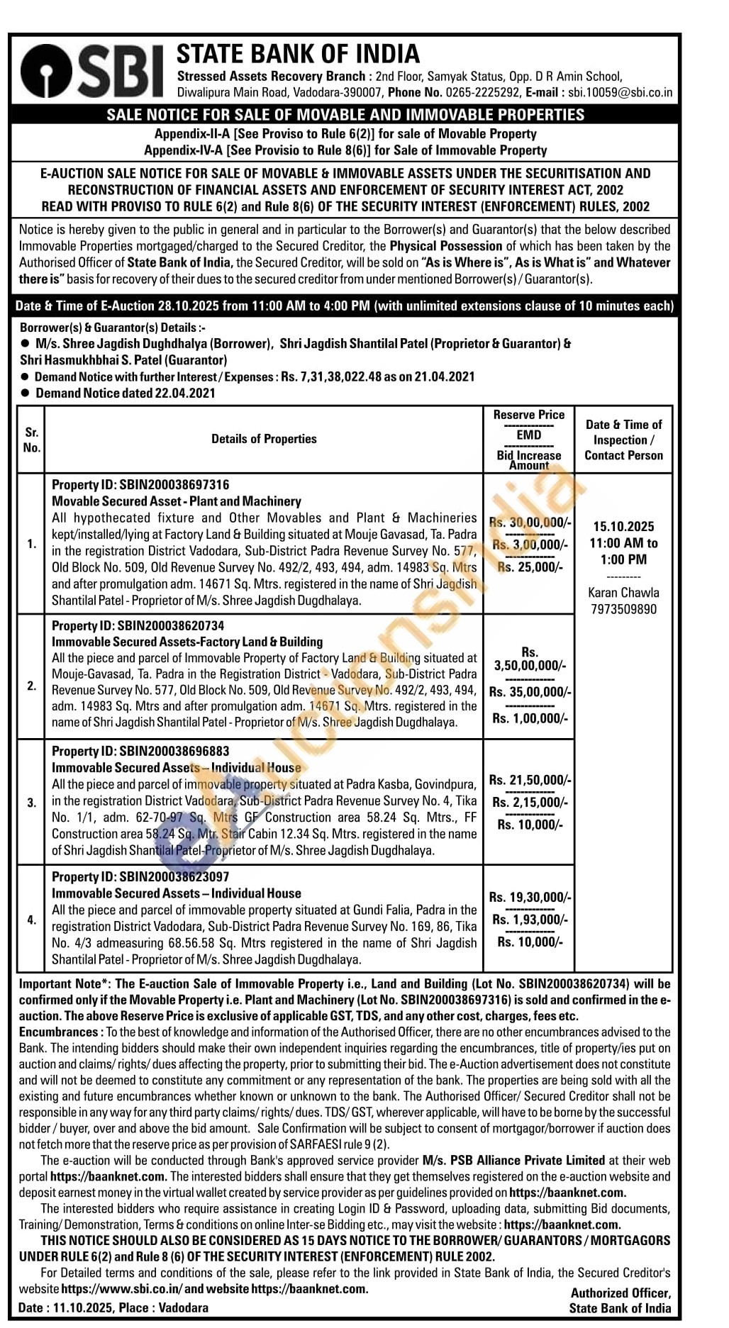 Immovable Secured Assets-Factory Land & Building All the piece and parcel of Immovable Property of Factory Land & Building situated at Mouje-Gavasad. Ta. Padra in the Registration District-Vadodara, Sub-District Padra Revenue Survey No. 577, Old Block No. 509, Old Revenue Survey No. 492/2, 493, 494. adm. 14983 Sq. Mtrs and after promulgation adm. 14671 Sq. Mtrs. registered in the name of Shri Jagdish Shantilal Patel-Proprietor of M/s. Shree Jagdish Dugdhalaya.