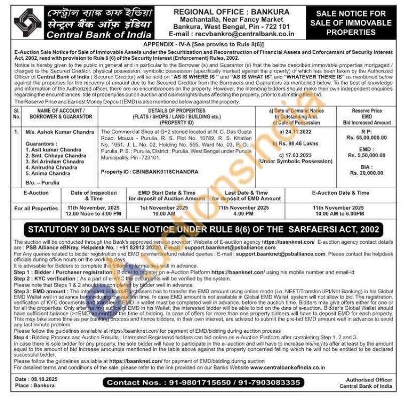 The Commercial Shop at G+2 storied located at N. C. Das Gupta Road, Mouza Purulia, R. S. Plot No. 10789, R. S. Khatian No. 1951, J. L. No. 02. Holding No. 555, Ward No. 03, P. O. Purulia, P. S.: Purulia, District: Purulia, West Bengal under Purulia Municipality, Pin-723101