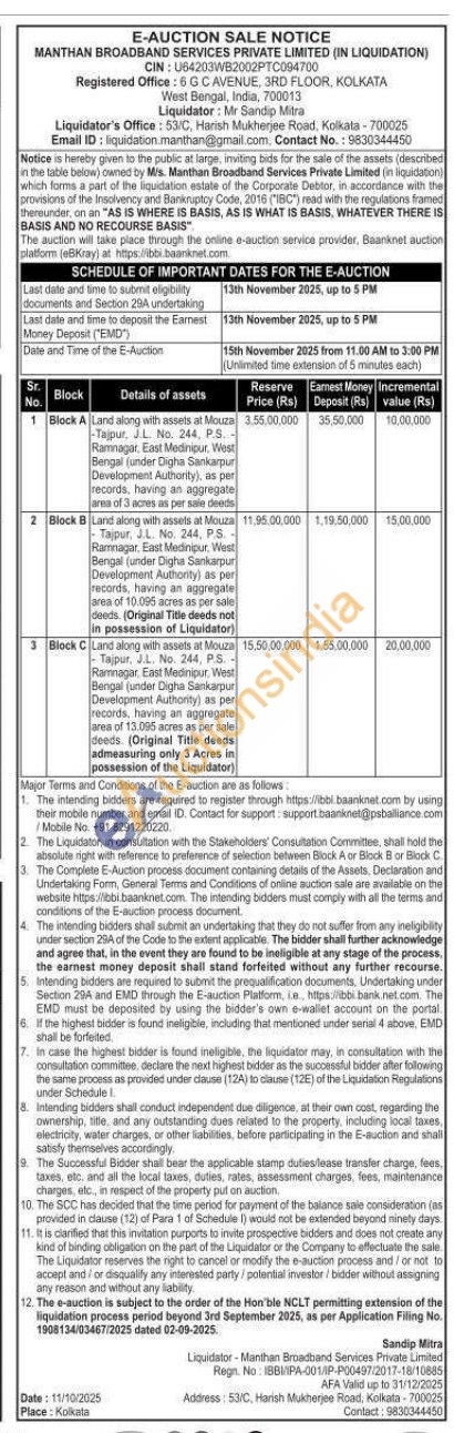 Block C Land along with assets at Mouza Tajpur, J.L. No. 244, P.S. Ramnagar East Medinipur, West Bengal (under Digha Sankarpur Development Authority) as per records, having an aggregate area of 13.095 acres as per sale deeds. (Original Title deeds admeasuring only 3 Acres in possession of the Liquidator