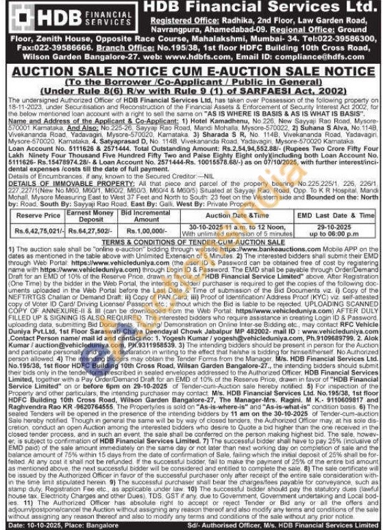 DETAILS OF IMMOVABLE PROPERTY: All that piece and parcel of the property bearing No. 225,225/1, 226, 226/1 227 227/1(New No M60, M50/1, M60/2, M60/3, M60/4 & M60/5) Situated at Sayyajı Rao, Road, Opp. To KR Hospital, Mandi Mohall, Mysore Measuring East to West 37 Feet and North to South 23 feet on the Western side and Bounded on the: North by: Road, South By: Sayyaji Rao Road, East By: Galli, West By: Private Property