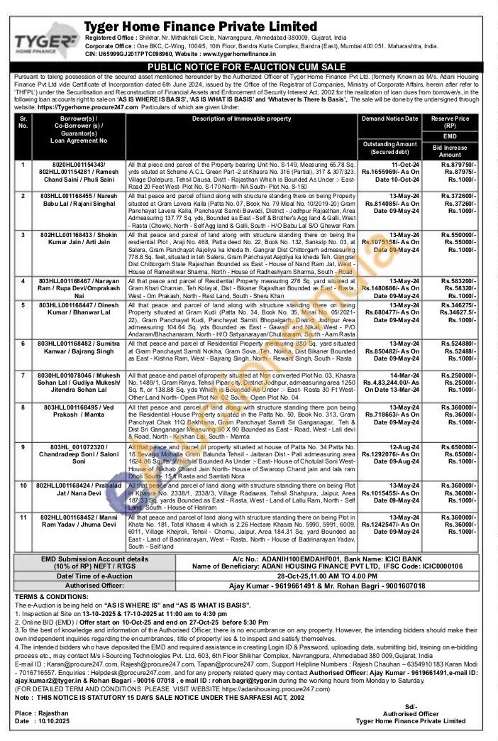 7) All that peace and parcel of property situated at Non converted Plot No. 03, Khasra No. 1489/1, Gram Rinya, Tehsil Pipar city, District Jodhpur, admeasuring area 1250 Sq. ft, or 138.88 Sq. yds Which is Bounded As Under: East- Rasta 30 Ft West-Other Land North-Open Plot No. 02 South-Open Plot No. 04