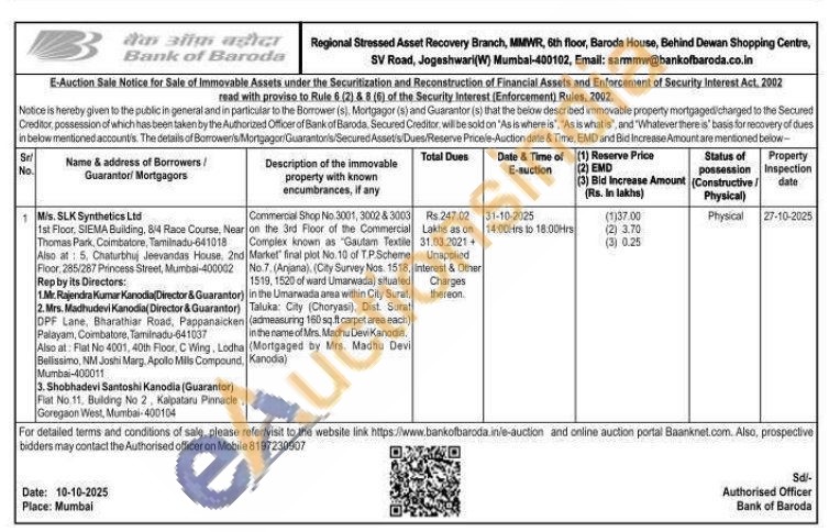 Commercial Shop No.3001, 3002 & 3003 on the 3rd Floor of the Commercial Complex known as "Gautam Textile Markel final plot No. 10 of T.P.Scheme No.7. (Anjana) (City Survey Nos. 1518, (admeasuring 160 sq.ft carpet area each) in the name of Mrs. Madhu Devi Kanodia. 1519, 1520 of ward Umarwada) situated in the Umarwada area within City Surat. Taluka: City (Choryasi), Dist. Surat (Mortgaged by Mrs. Madhu Devi Kanodia)