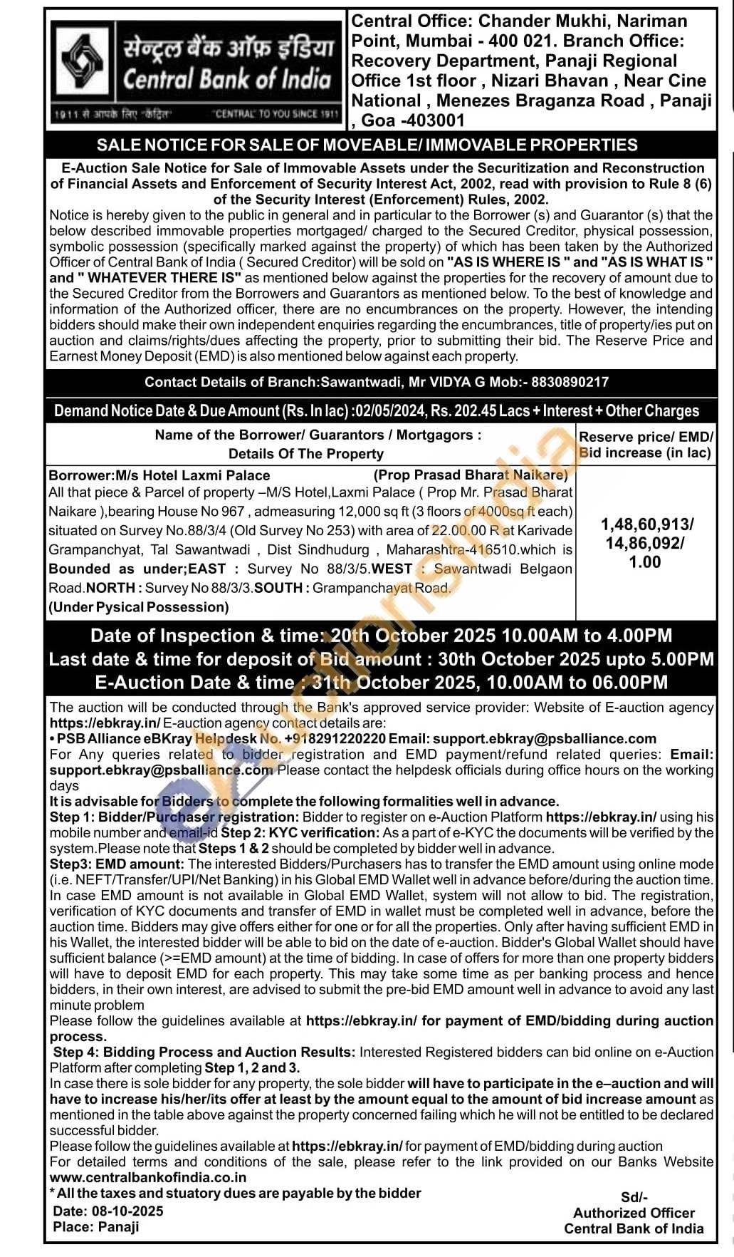 All that piece & Parcel of property -M/S Hotel, Laxmi Palace (Prop Mr. Prasad Bharat Naikare), bearing House No 967, admeasuring 12,000 sq ft (3 floors of 4000sq ft each) situated on Survey No.88/3/4 (Old Survey No 253) with area of 22.00.00 R at Karivade Grampanchyat, Tal Sawantwadi, Dist Sindhudurg, Maharashtra-416510.which is Bounded as under; EAST: Survey No 88/3/5.WEST: Sawantwadi Belgaon Road. NORTH: Survey No 88/3/3.SOUTH: Grampanchayat Road