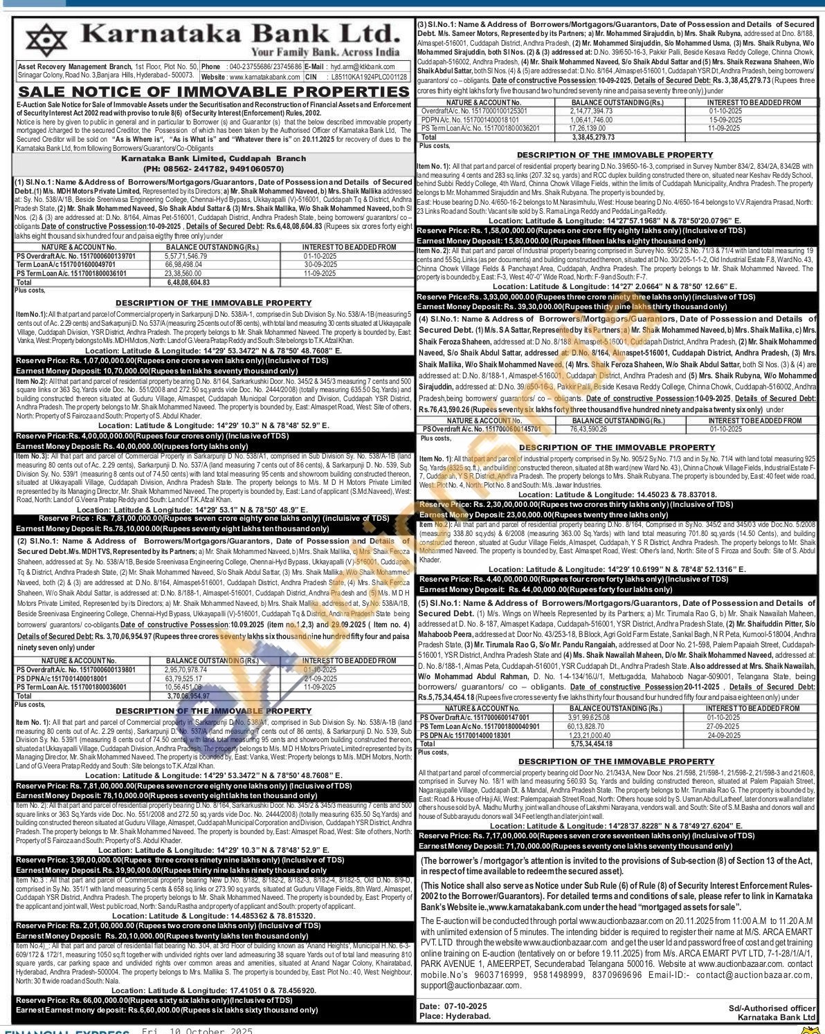 Item No.2): Allthat part and parcel of residential property bearing D.No. 8/164, Sarkarkushki Door. No. 345/2 & 345/3 measuring 7 cents and 500 square links or 363 Sq. Yards vide Doc. No. 551/2008 and 272.50 sq.yards vide Doc. No. 2444/2008) (totally measuring 635.50 Sq. Yards) and building constructed thereon situated at Guduru Village, Almaspet, Cuddapah Municipal Corporation and Division, Cuddapah YSR District, Andhra Pradesh. The property belongs to Mr. Shaik Mohammed Naveed. The property is bounded by, East: Almaspet Road, West Site of others, North: Property of S Fairoza and South: Property of S. Abdul Khader.